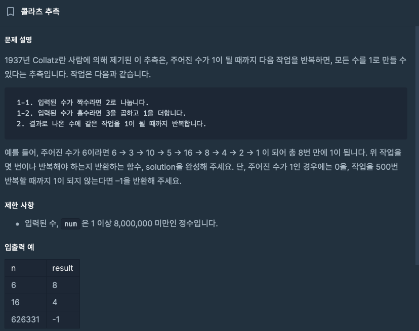 • 이 과정은 최대 500번까지만 반복하며, 그 이상 반복해도 1이 되지 않는 경우에는 -1을 반환한다.