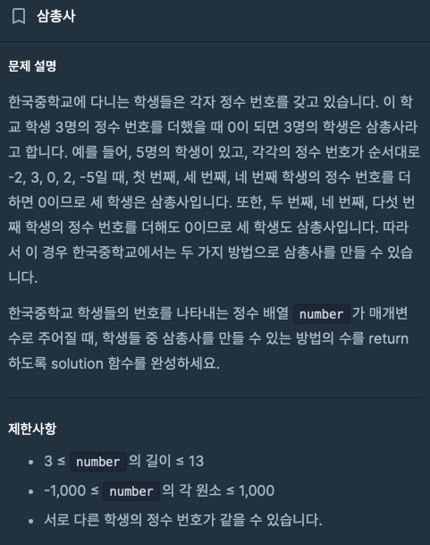 1) 3명의 정수 번호를 더해서 0이되면 3명의 학생은 삼총사 이게 핵심! (3중 for문)